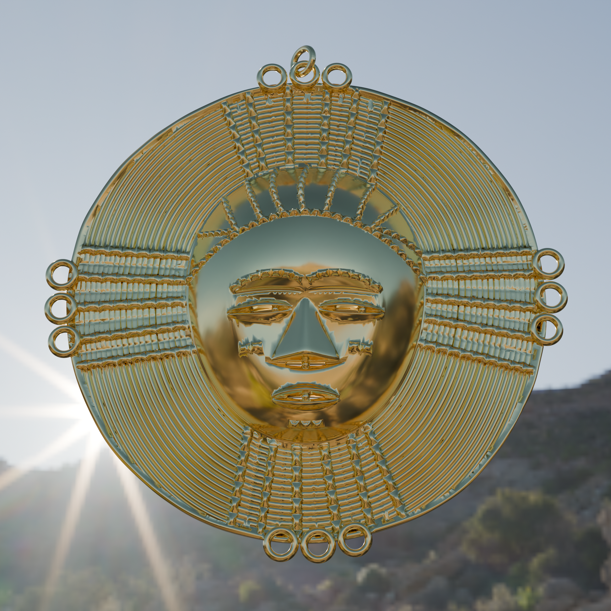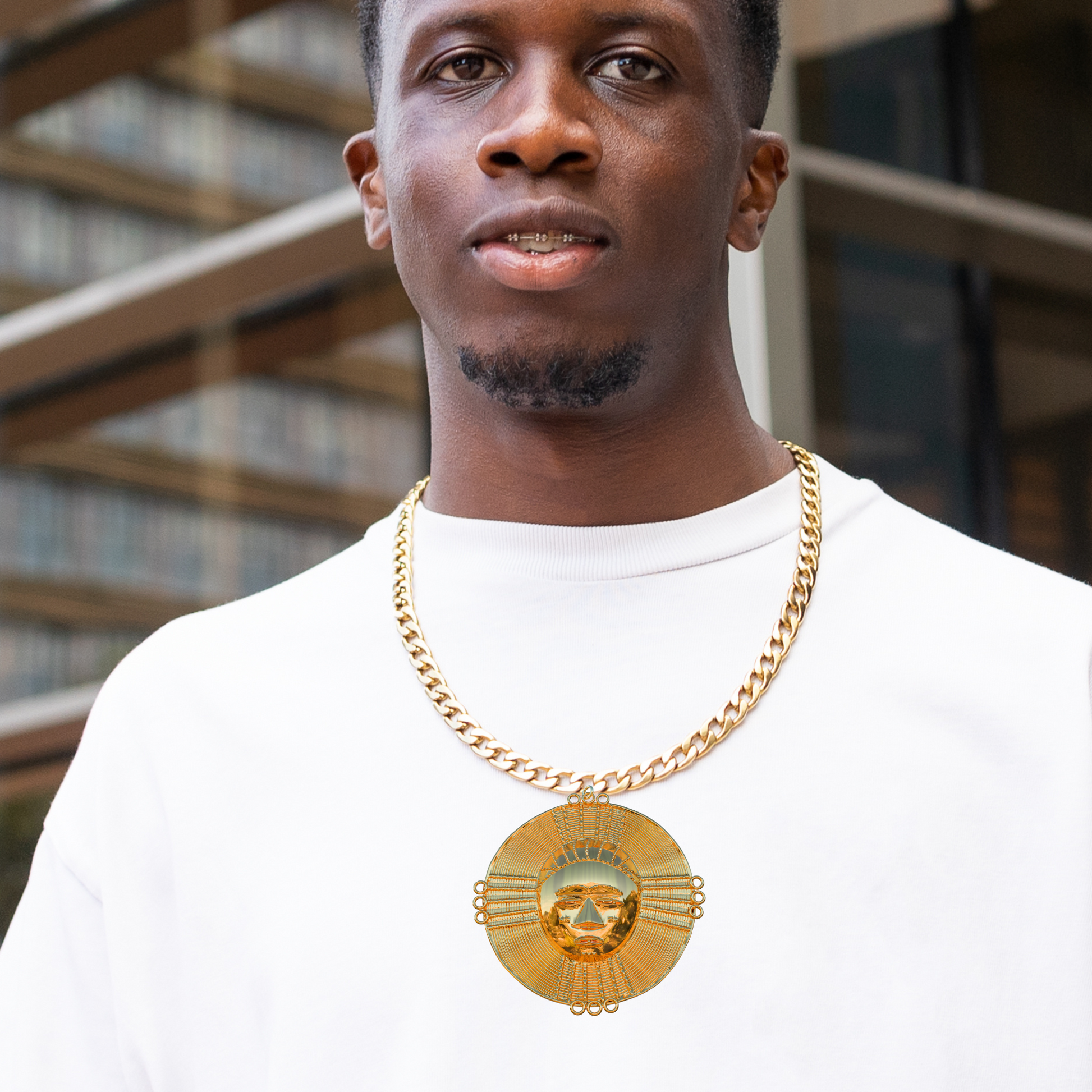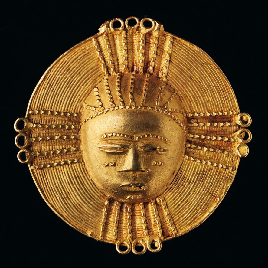 Handmade reproduction of a magnificent Akan gold alloy trailer pendant. The 1800s artifact pendant is in private collection. Original: face surrounded by gold coils with filigree and granulated detail and hammered repoussé back. Replica: 3d printed to fractions of a mm accuracy, and lost wax cast to order.