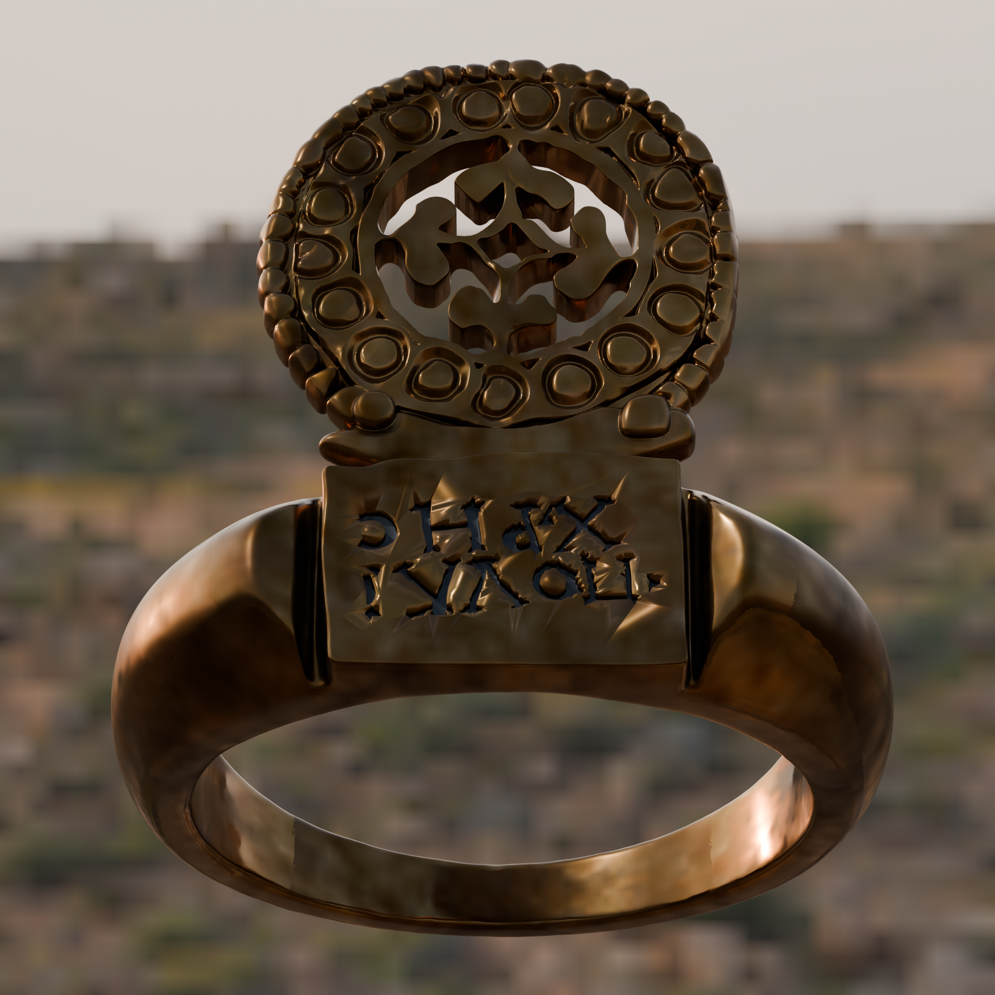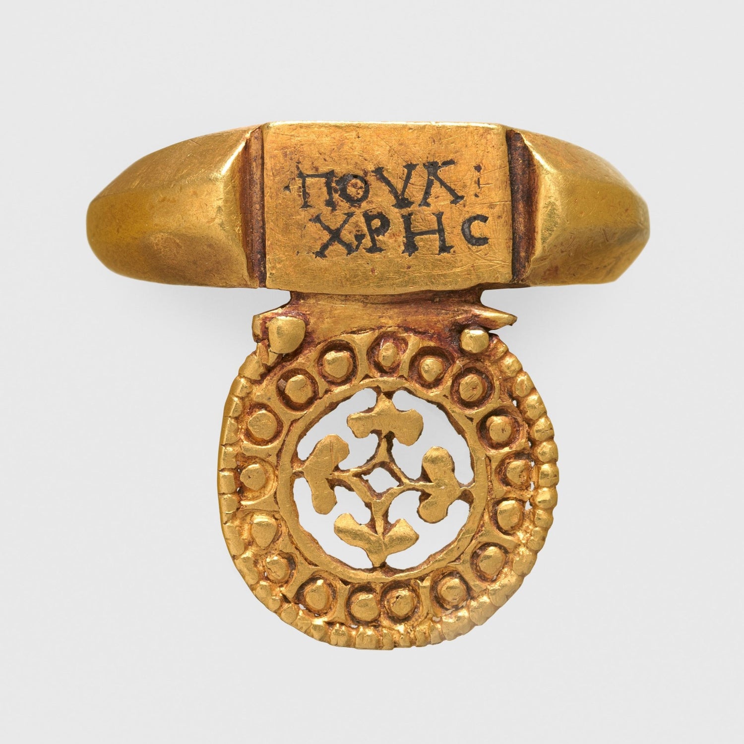 The Latin inscription Poulchrīs translates to Beauty's Ring, interpreted as subtle praise to the owner.