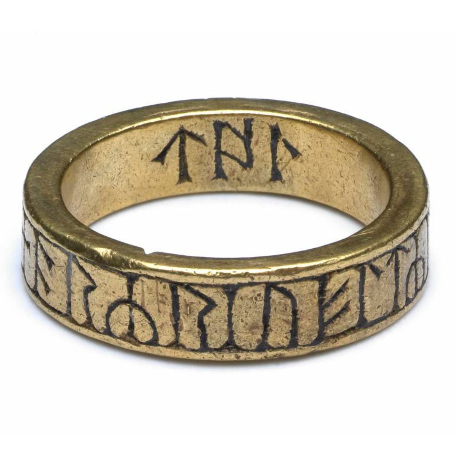 Gold finger-ring, engraved with a runic inscription around the hoop between nielloed lines; three letters continuing on inside of hoop.