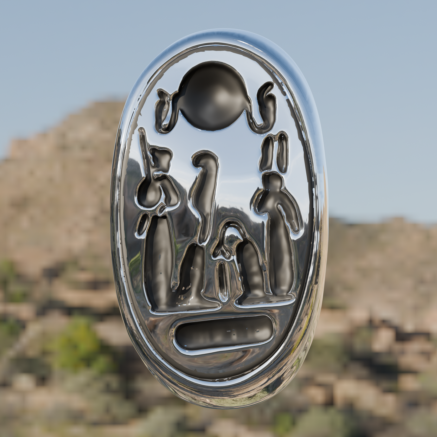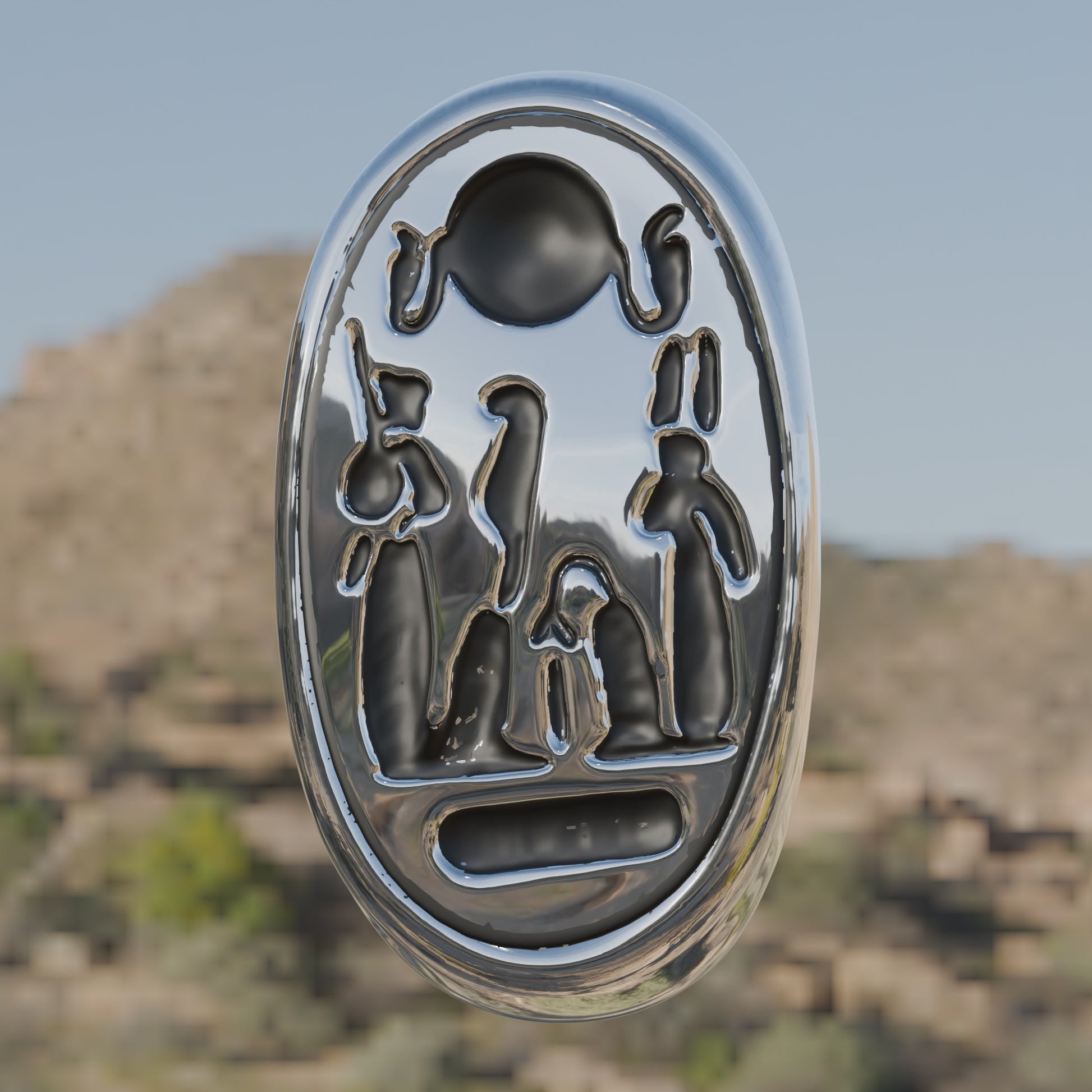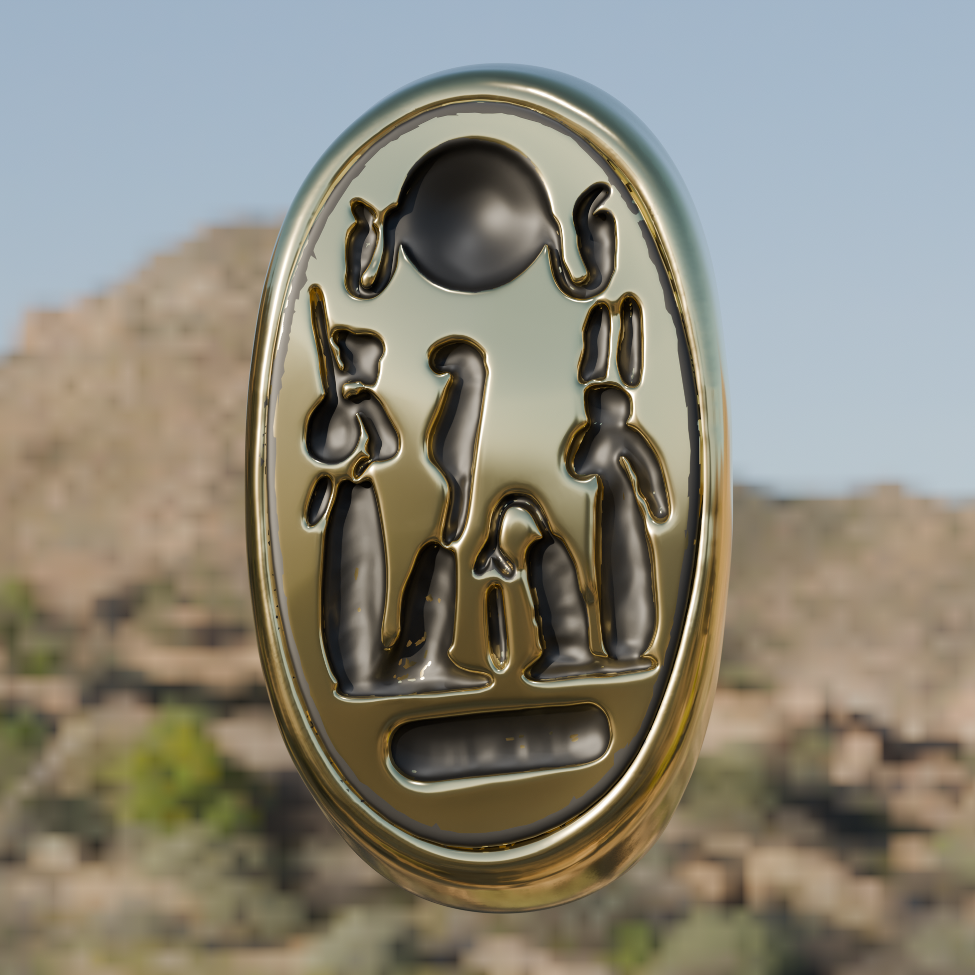 This ring was found at Amarna. The hieroglyphs may be read as an ideogram. The two seated figures are probably Akhenaten (left) and Nefertiti (right) as the deities Shu (air as indicated by the feather he holds) and Tefnut (moisture). They were father and mother of the earth and sky, which are symbolically represented by the earth hieroglyph (below) and by the sun disk flanked by two sacred cobras (above).