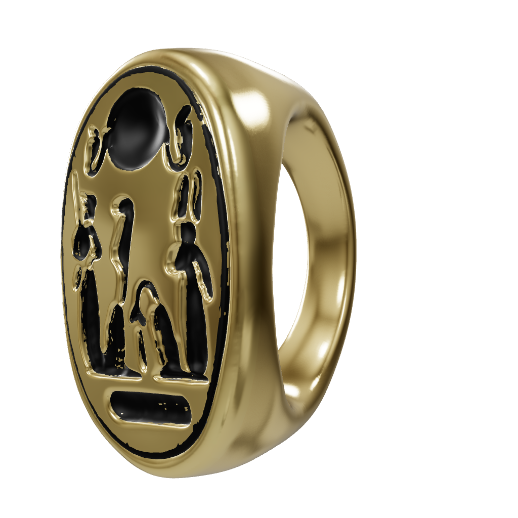 Lost wax cast gold reproduction of a ring depicting King Akhenaten and Queen Nefertiti as Shu and Tefnut. The inspiration for this ring is an Ancient Egyptian artifact which was forged around 1350 BC and is housed at the Met.